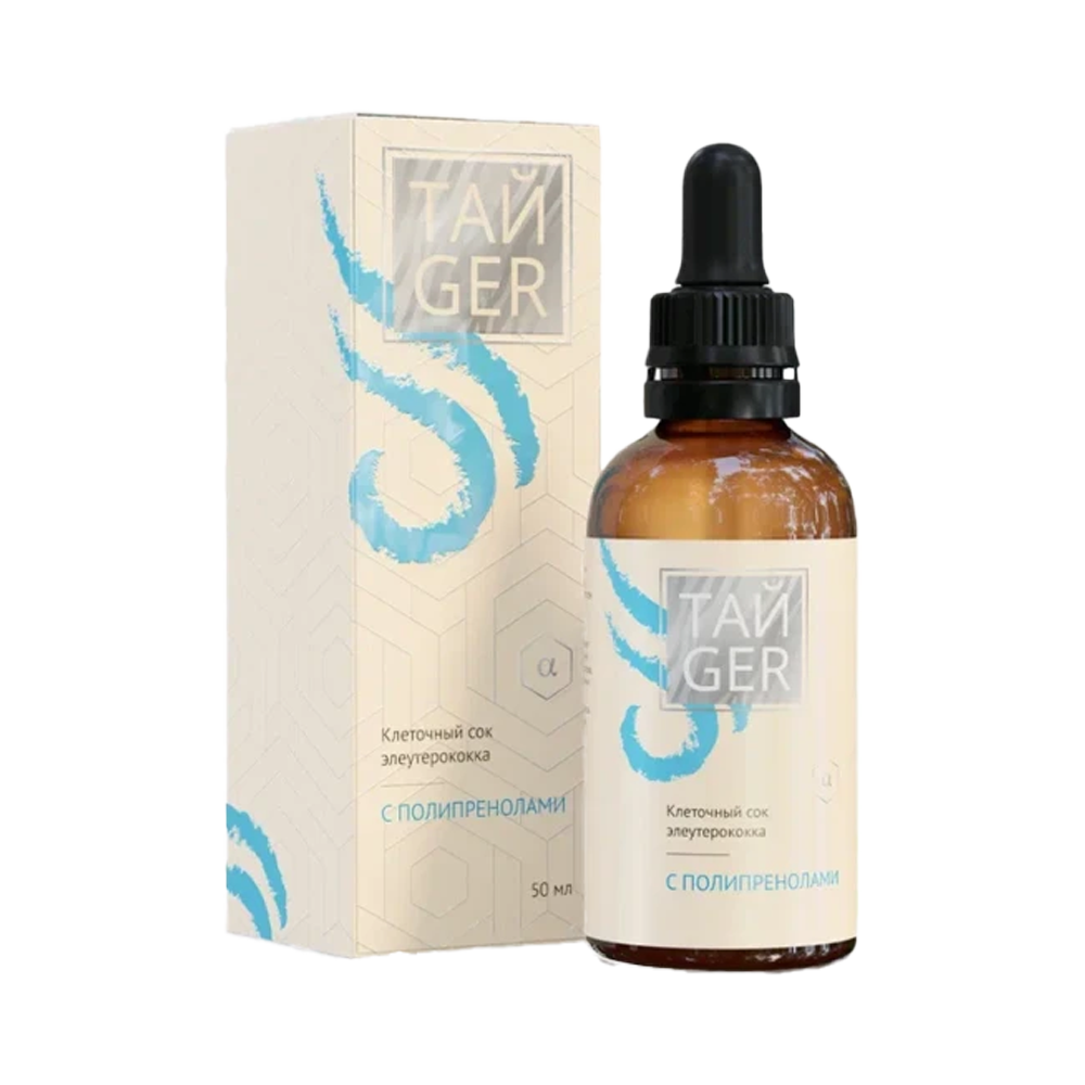 Клеточный сок элеутерококка с полипренолами ТАЙGER – восстанавливающий комплекс с мощным тонизирующим действием. Комплекс обеспечивает клетки организма энергией и оказывает положительное влияние на функционирование нервной ткани, адаптационные возможности и иммунитет. Активация работы ЦНС устраняет сонливость, раздражительность, стимулирует интеллектуальную и физическую работоспособность, повышает жизненный тонус после стрессов и перенесённых заболеваний. Нейропротективное действие комплекса улучшает память, остроту слуха и зрения: повышает светочувствительность и цветовосприятие сетчатки глаза, чувствительность волосковых клеток кортиева органа уха.