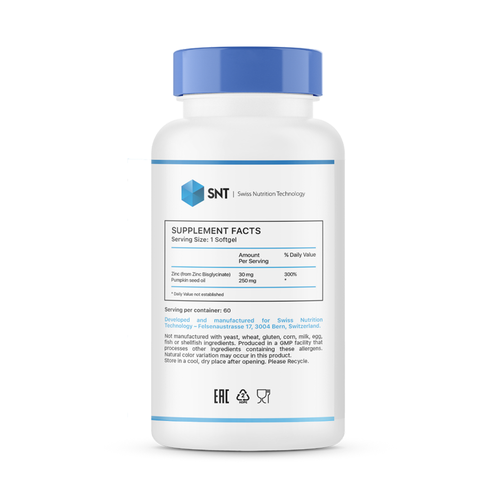 Хелатные формы цинка с наилучшим усвоением. Цинк является иммуномодулятором, тормозя распространение вируса в организме и стимулируя выработку клеток Т-киллеров. Этот минерал участвует в образовании тестостерона и инсулина, необходим для нормализации сахара в крови, влияет на рост волос, состояние ногтей и на секрецию сальных желез, а также укрепляет кости.
