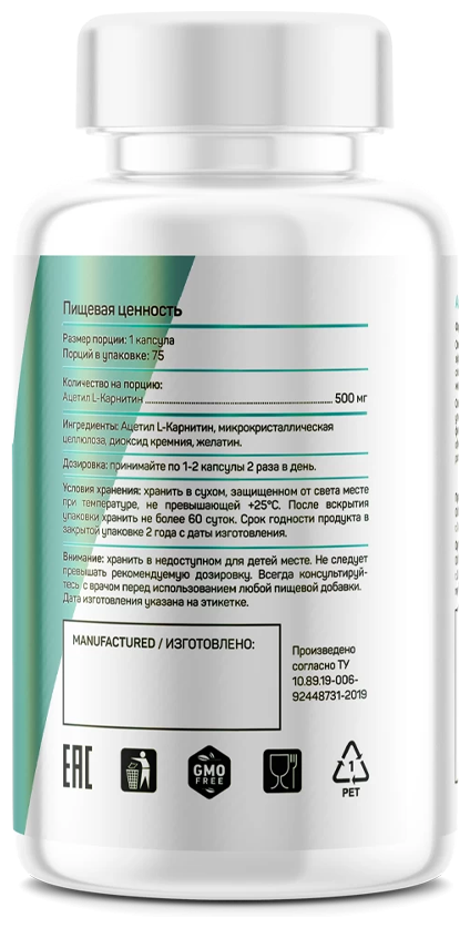 ацетил L-Карнитин, желатин, микрокристаллическая целлюлоза, диоксид кремния.