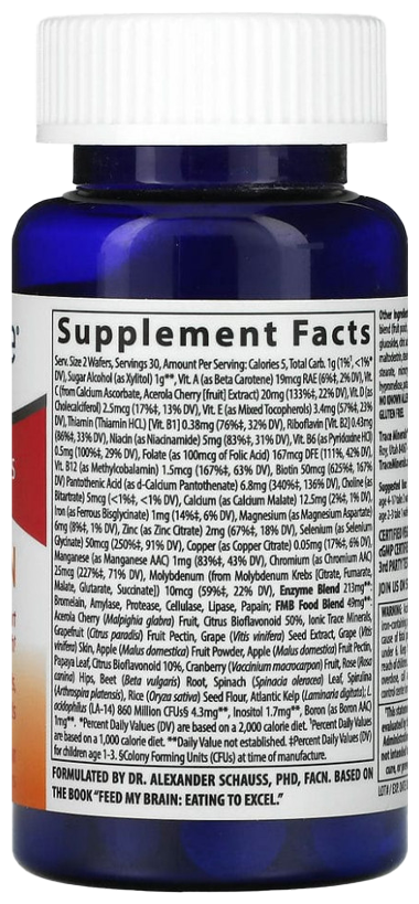 плод мальпигии гранатолистной (Malpighia glabra), цитрусовый биофлавоноид 50%, микроэлементы иона, грейпфрутовый пектин (Citrus paradisi), экстракт виноградных косточек (Vitis vinifera), виноградная кожура (Vitis vinifera), яблочный порошок (Malus domestica), яблочный пектин (Malus domestica), листья папайи, цитрусовый биофлавоноид 10%, клюква (Vaccinium macrocarpon), экстракт баланитеса (Balanites aegyptiaca), шиповник (Rosa canina), корнеплод свеклы (Beta vulgaris), листья шпината (Spinacia oleracea), спирулина (Arthrospira platensis), рисовая мука (Oryza sativa), атлантическая листовая капуста (Laminaria digitata); L acidophilus (LA-14) 860 млн КОЕ§ 4,3 мг**, инозитол 1,7 мг**, бор (в виде бора AAC) 1 мг**.